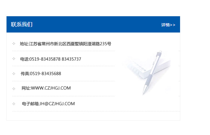 地址:常州市新北區(qū)友邦商務(wù)大廈1幢16、17層  電話(huà):0519-85101652  傳真:0519-85112595  郵編:213022  網(wǎng)址:www.cz-jiayue_cn.jihuadz.com  郵箱:xiajifengaa@163.com
